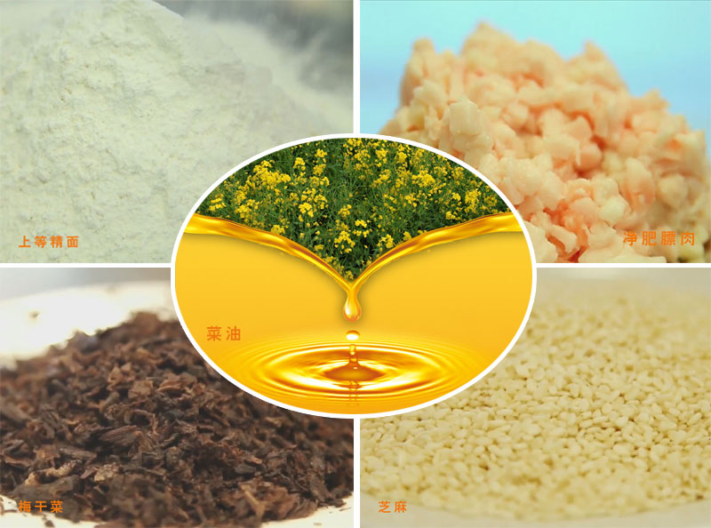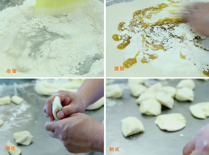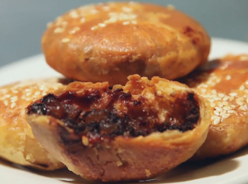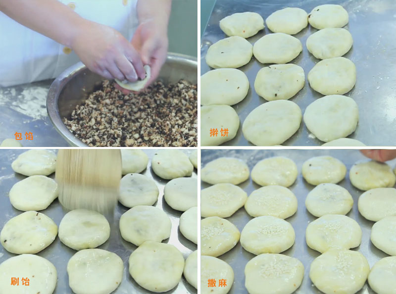 具体制作方法:用标准面粉一斤,菜油一两五钱,肥猪肉四两,干菜(咸)二两五钱,木炭半斤,糖稀、味精、酱油少许。首先把肥猪肉切成小方丁儿,将梅干菜切碎,加上少许味精、酱油拌匀待用。接着将一斤面粉用水半斤(30%开水泡过后,再用70%冷水拌匀和拢),任其发酵几分钟后,再用碱或苏打粉一钱左右,搓扁后滚薄,涂上素油,撒点生面粉,转起来,搓成长条,摘分二十个粉团,把切好的馅逐个包在粉团中间,揿平成饼状,涂上糖稀,撒上芝麻,贴上烘炉(炉内要热,四周热度均匀,可用一小团面试试炉子,面团若呈白色则显得不够热,若呈黑色则显得太热,只有呈黄色则显得炉子热度适中),待烧饼烘成黄色后,下面炉口闭火二三分钟,使得烧饼发酥,猪肉出油,即可出炉。因为这类烧饼外皮酥脆,并且含有梅干菜的清香鲜味,形似螃蟹背壳,色泽泛黄,故得名“蟹壳黄”。刚刚出炉的“蟹壳黄”不待入口,便觉香味浓烈,咬上一口,既酥又脆,层层剥落,满口留香。“蟹壳黄”色泽蟹黄,饼层多而薄,外形厚,口味香,甜、辣、酥、脆,由于烘烤时间长,饼中水分大多蒸发,利于贮存,一旦受潮烘烤后依然酥香如故,酥松油润而不腻。